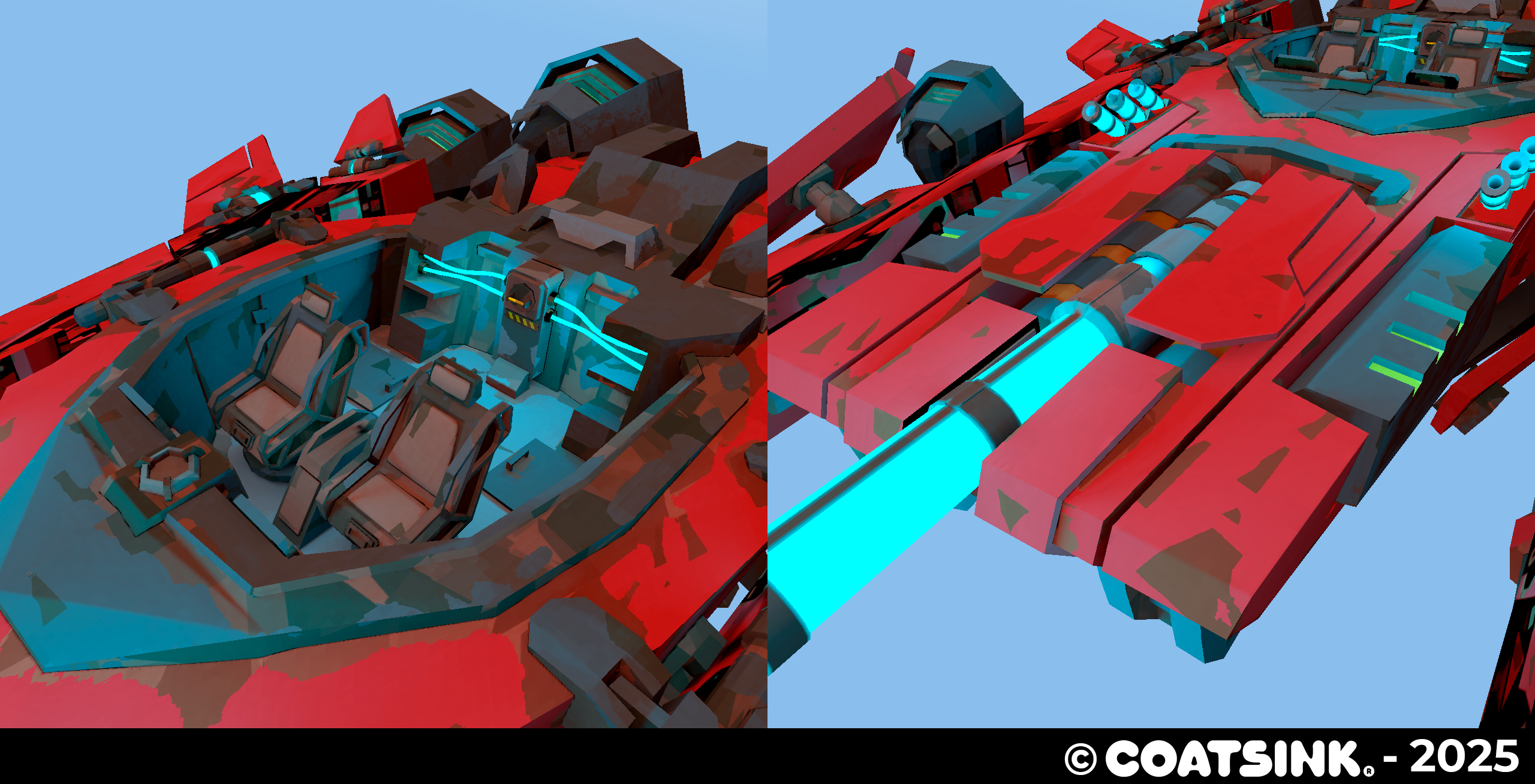Dynamic objects like the player's ship and weapons did have a lot of emissives and wear and tear. In order to make those effects tangible on the shader we baked Emission Indirect lighting, curvature and AO manually as a texture inputed to the shader. That was the case til I made a MaxScript tool for the 3D artists of the project that baked the textures automatically and packed them into a single texture.