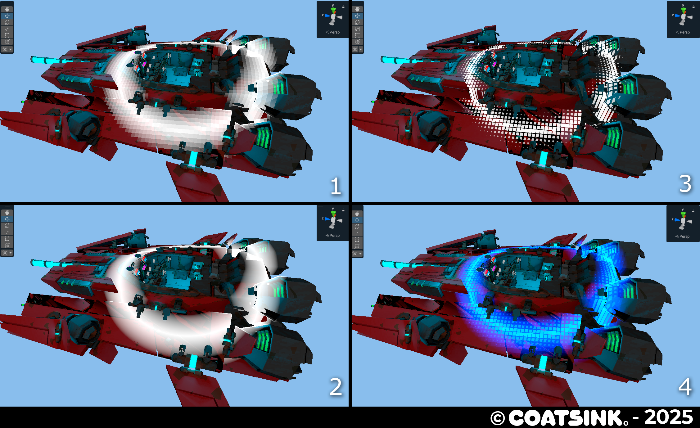 Our concept artist wanted the ship shield to feel like a second skin that reacted dynamically to the Shades/Enemies projectiles. Using a custom mesh that surrounds the ship and a custom shader it displays to the player where they've been hit (directionality) and the health of the different pieces of the shield.