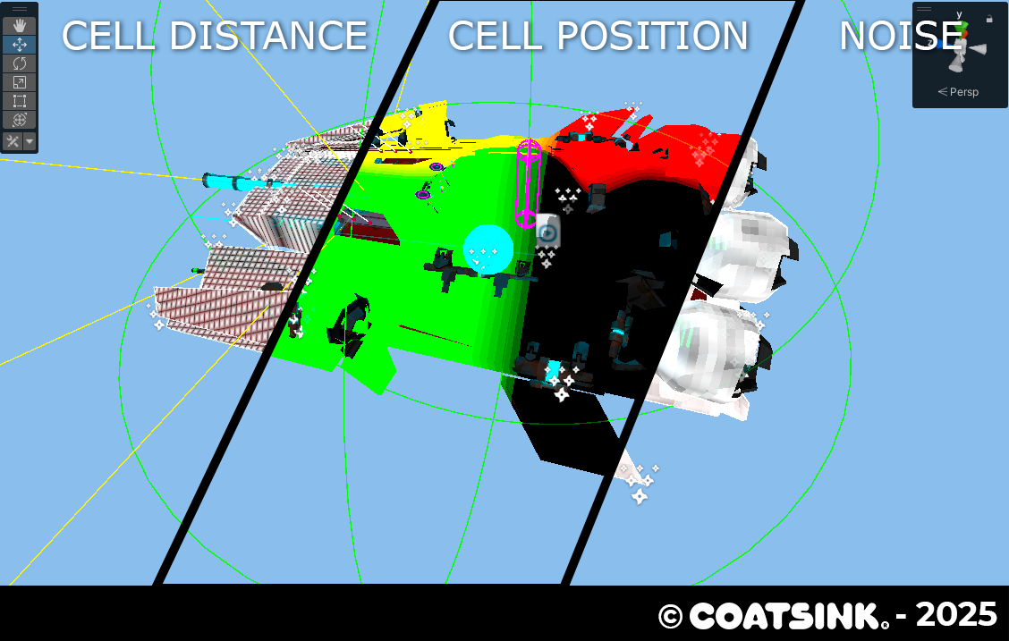 - A sphere maks defines the area that has been damaged and by using a triangle wave it creates a subtle animation, cells are masked by the array of sphere masks.